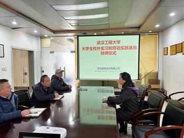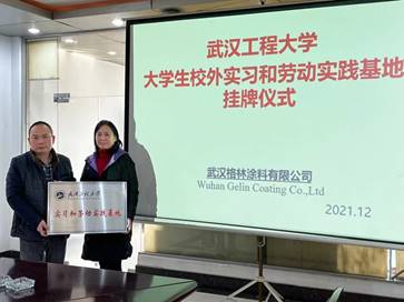 在实习基地挂牌仪式上,化环学院副院长王营茹向企业负责人介绍了学院的化工背景、专业特色以及与涂料相关的科研团队。王院长表示希望通过以实习实践基地建设为契机,与武汉格林涂料有限公司开展多方面的合作交流,为学生提供更多实践锻炼的机会。希望并欢迎武汉格林涂料有限公司来武汉工程大学招聘人才、深化合作。