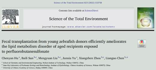 vic115维多利亚胡陈艳博士与中国科学院水生生物研究所陈联国研究员利用斑马鱼为模式生物,通过移植年轻斑马鱼粪便到老年斑马鱼,发现粪菌移植可彻底拮抗PFBS的内分泌干扰效应和生殖毒性,将老年个体的内分泌系统重塑为年轻表型,促进卵子发育,提高繁殖能力。同时,另一工作也发现粪菌移植可以显著促进老年个体的生长,减轻老龄化及PFBS引起的肝组织损伤。对老年动物的脂质代谢能力也具有显著激活能力,能有效地抑制由老龄化或/和PFBS引起的代谢异常,将血液甘油三酯的浓度恢复至年轻动物的水平(此工作发表于另一Top期刊Science of the Total Environment(Hu et al, 2022, 823, 153758;IF:10.753))。以上研究为粪菌移植在环境与健康领域的应用提供了新的思路,将助力粪菌移植成为污染物毒性干预及健康老龄化的新策略。